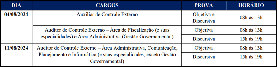 Serão realizadas Prova Objetiva de múltipla escolha e Prova Discursiva, ambas de caráter eliminatório e classificatório, e Avaliação de Títulos, de caráter classificatório, apenas para o cargo de Auditor de Controle Externo.
