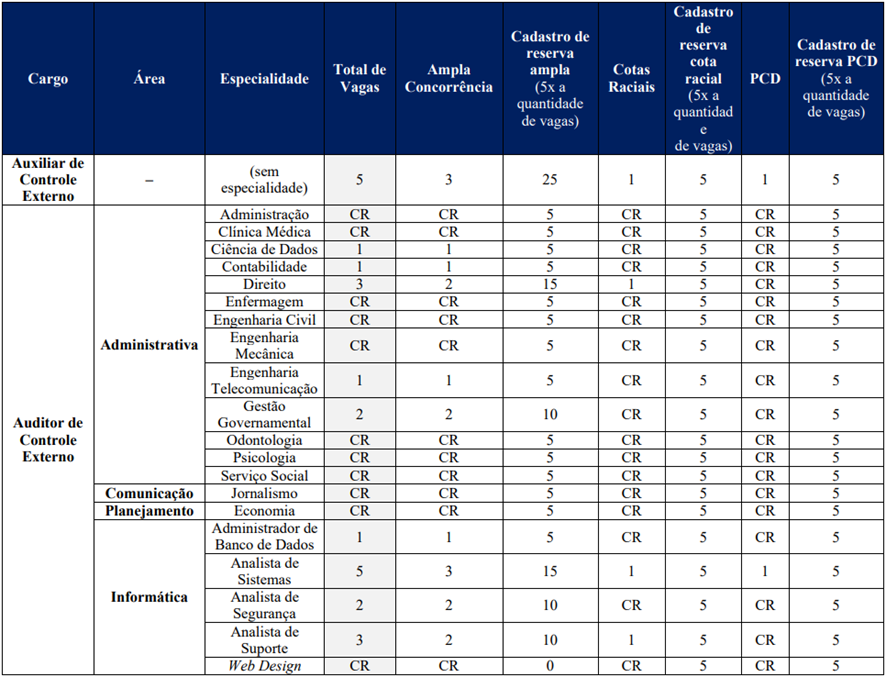 O Concurso Público visa ao preenchimento de 45 (quarenta e cinco) vagas para o cargo de Auditor de Controle Externo, de Nível Superior, e 5 (cinco) vagas para o cargo de Auxiliar Técnico de Controle Externo, de Nível Médio, e formação de Cadastro de Reserva, do Tribunal de Contas do Estado do Pará, observado o prazo de validade deste certame, respeitando o percentual mínimo de 5% (cinco por cento) das vagas para candidatos com deficiência, em conformidade com a Lei estadual nº 5.810/1994, e o percentual mínimo de 20% (vinte por cento) das vagas para os candidatos negros ou pardos, em conformidade com a Resolução TCE-PA nº 19.607/2024.