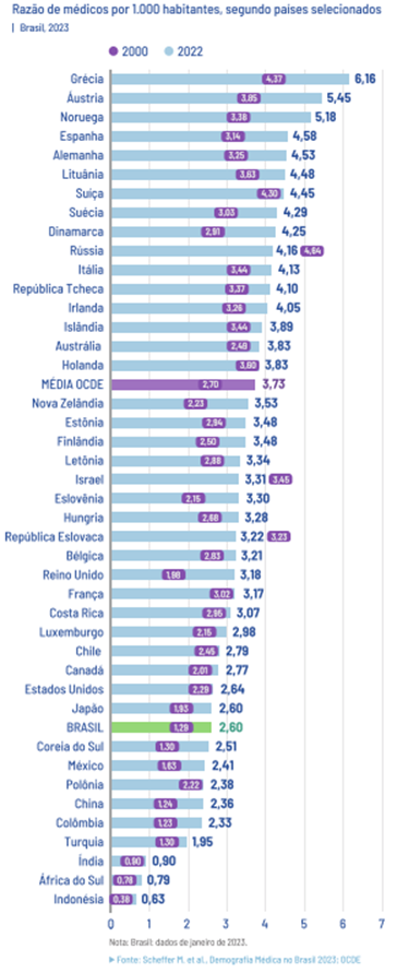 Extrai-se da figura acima que o Brasil apresenta uma taxa de 2,6 em 2022 comparada com média da OCDA de 3,73. Logo, entende-se que o Brasil teria “espaço” para aumentar seu quantitativo de médicos.